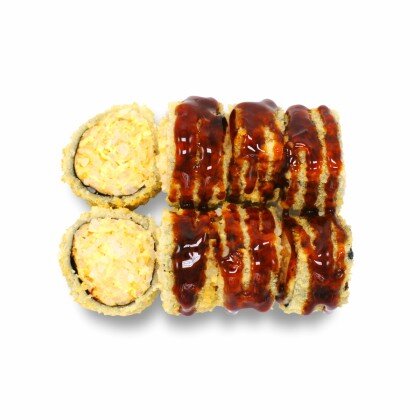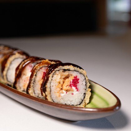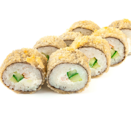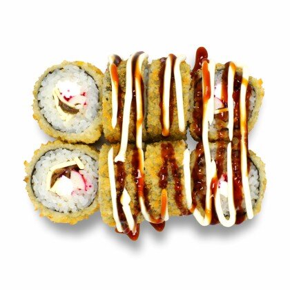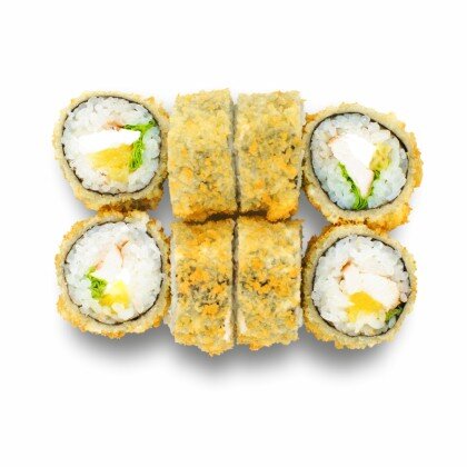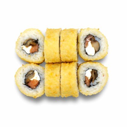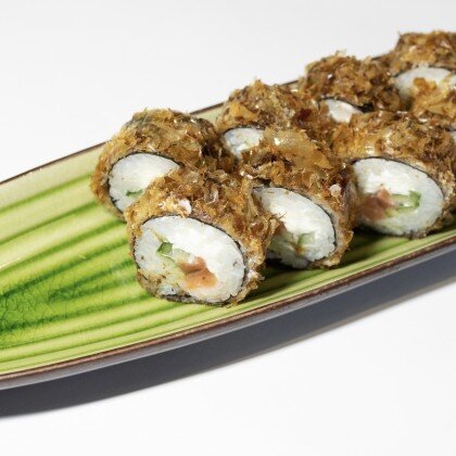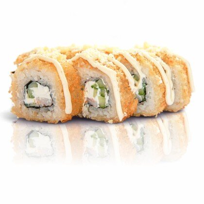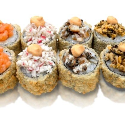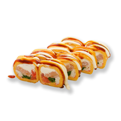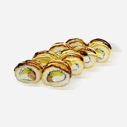 Копченая форель, сыр сливочный, помидор, лук зеленый, нори, рис.