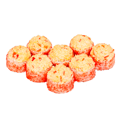Сыр сливочный, масаго, сурими. шапочка: лосось, мидии, сыр, соус спайси, нори, рис